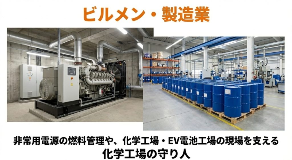 ガソリンスタンドから大型タンクローリー、ビル管理まで、この資格一つで挑戦できるフィールドは驚くほど多岐にわたります。